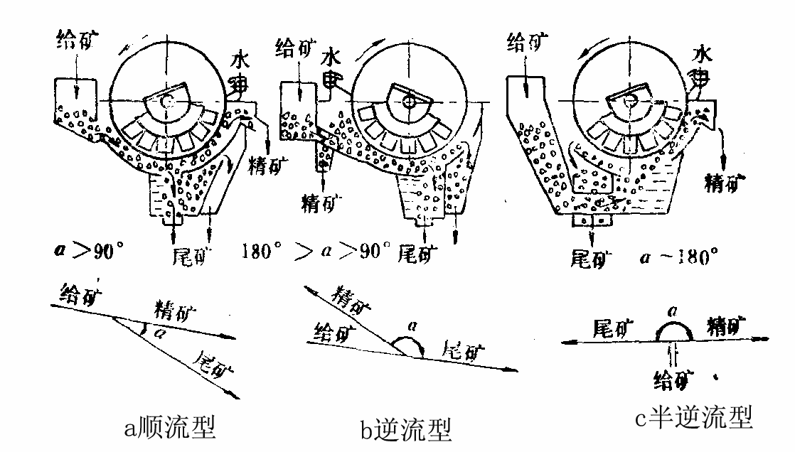 由于磁極的極性沿圓筒旋轉(zhuǎn)方向是交替排列的,并且在工作時(shí)固定不動(dòng),“磁團(tuán)”或“磁鏈”在隨圓筒旋轉(zhuǎn)時(shí),由于磁極交替而產(chǎn)生磁攪拌現(xiàn)象,被夾雜在“磁團(tuán)”或“磁鏈”中的脈石等非磁性礦物在翻動(dòng)中脫落下來,##終被吸在圓筒表面的“磁團(tuán)”或“磁蓮”即是精礦。精礦隨圓筒轉(zhuǎn)到磁系邊緣磁力##弱處,在卸礦水管噴出的沖洗水流作用下被卸到精礦槽中,如果是全磁磁輥,卸礦是用刷輥進(jìn)行的。非磁性或弱磁性礦物被留在礦漿中隨礦漿排出槽外,即是尾礦以下是下選式的幾種形式:
