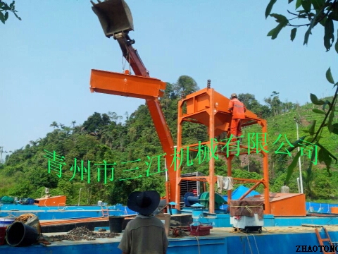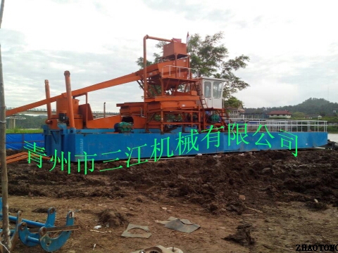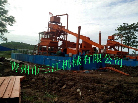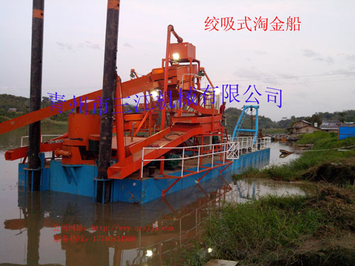 本設(shè)備的上料系統(tǒng)為6英寸抽沙泵,抽沙形式為絞刀頭和泵組成的絞吸式抽沙系統(tǒng),篩分系統(tǒng)為多層振動篩。淘金系統(tǒng)為兩套鼓動式淘金溜槽和固定式淘金氈溜槽組成的組合淘金槽。另外還配有一套60型淘金離心機(jī)。本設(shè)備挖掘深度為16米,由于是由絞刀頭組成的絞吸式抽沙方式,所以可以適應(yīng)復(fù)雜的工況條件,比如含有硬泥層的地形。
