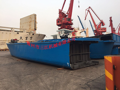 馬爾代夫客戶定做的帶跳板(通行甲板)300噸甲板駁船,從上海港裝散貨船,海運至馬爾代夫馬累港后組裝。